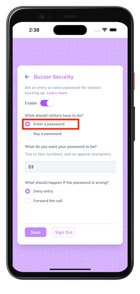 To set an entry code password on your apartment suite, simply head on over to Buzzer Security from your suite settings, and follow the on-screen prompts.